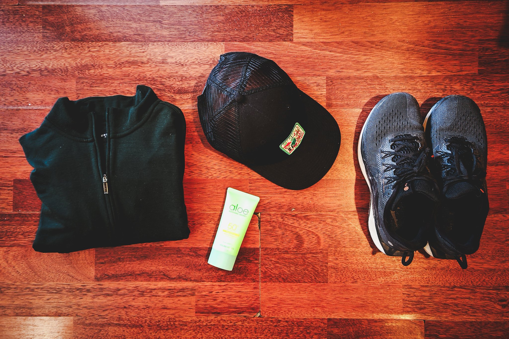 My core clothing items for Santiago: Base layers (2 tanks, 1 tee), long sleeve, mid-layer (quarter zip), outer layers (pictured: puffer for colder weather, not pictured: windbreaker for summer nights), bottoms (1 running pants, 1 shorts for summer, not pictured: 1 leggings for colder weather).